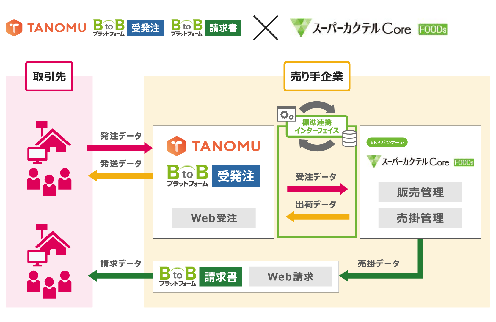 この標準連携インターフェースにより、「スーパーカクテルCoreFOODs」と「BtoBプラットフォーム 受発注」「TANOMU」導入の際に、連携システムを個別に開発することなく、短期間でシステム連携を開始できるようになります。